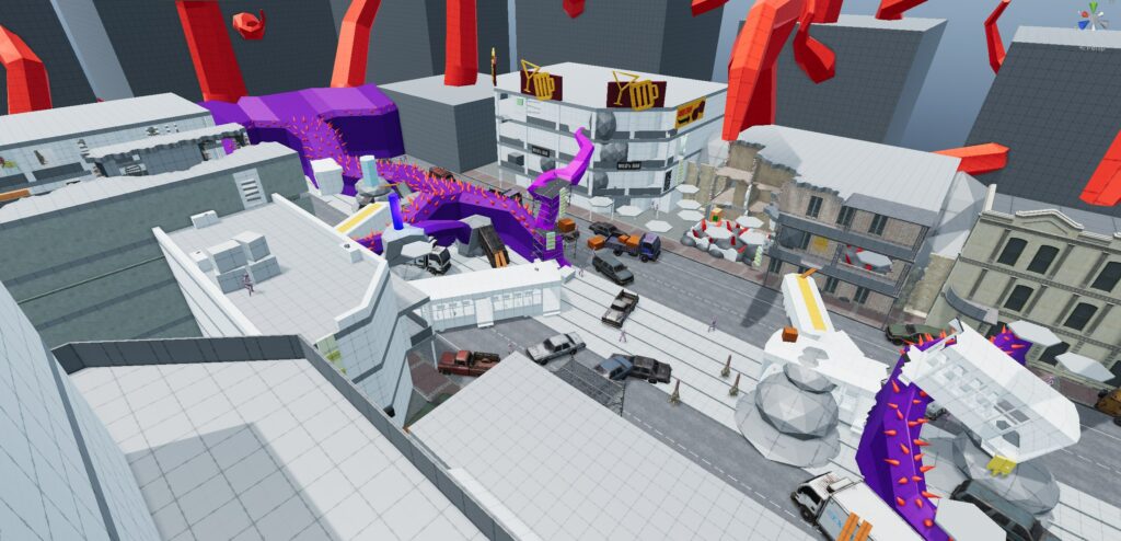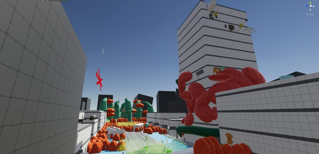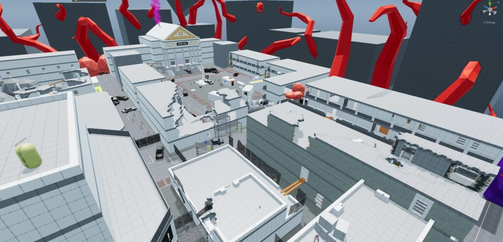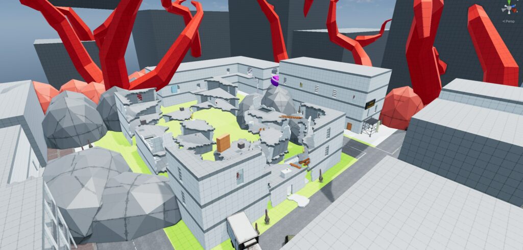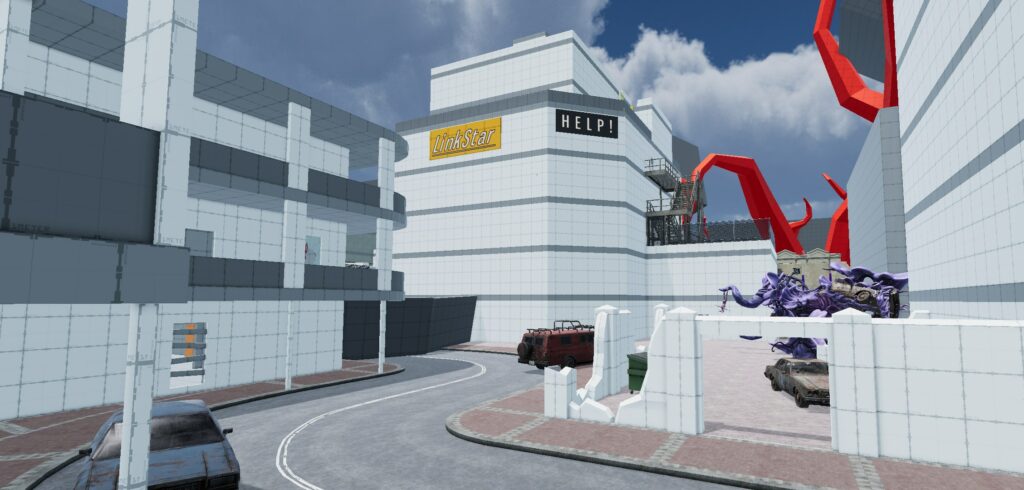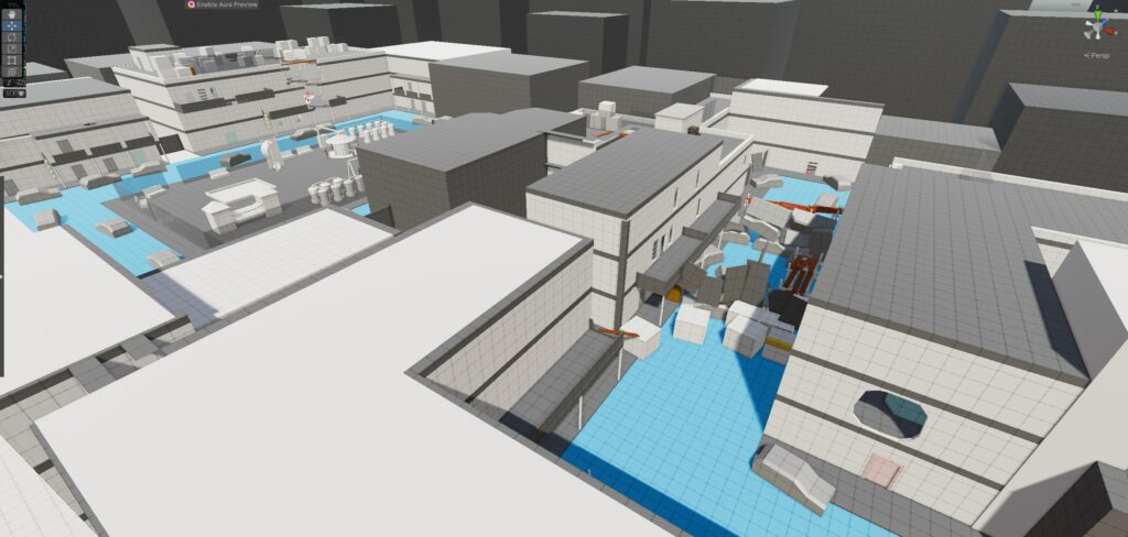 Proste blockouty, które początkowo zrobiłem dla każdej mapy miały na celu pokazać tylko odległości oraz kompozycję. Utwierdzając się, że wszystko jest jak należy, przeszedłem do opracowania blockoutów bardziej detalicznych. Wykorzystałem do tego narzędzie Probuilder i porobiłem z nich prefaby, by mogli z nich korzystać pozostali Level Designerzy. Dalsze planowanie i tworzenie opierało się już całkowicie na nich. Poniżej opiszę proces tworzenia każdej z map, nad którymi pracowałem. Użyte zostaną tutaj nazwy robocze.