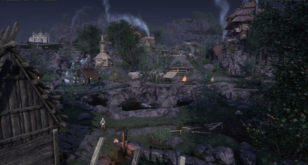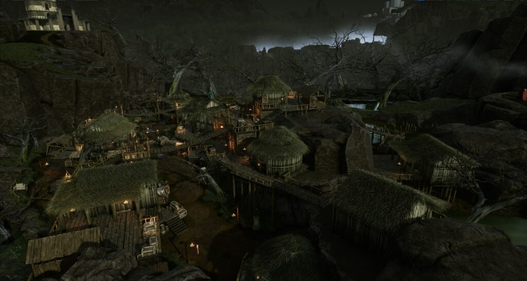 Wraz z nowymi założeniami, dostałem za zadanie stworzyć wioskę. Moją pierwszą myślą, jeśli chodzi o lokację, było posadzenie jej na środku bagien, by mogła zastąpić poprzedni tamtejszy POI, jednocześnie wyraźnie będąc granicą między obiema częściami bagien. Używając prostych kształtów, stworzyłem wstępny układ oraz blockout wioski. Gdy graficy dostarczyli mi potrzebne assety, przeszedłem do Level Artu oraz oświetlenia.