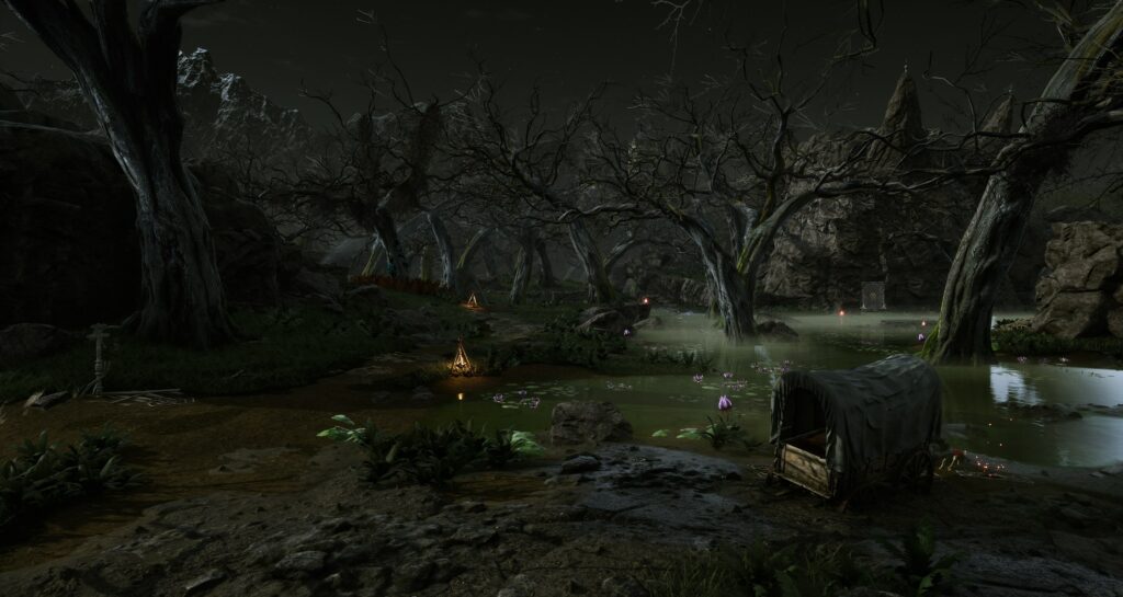 Moim głównym celem było wyciągnięcie głównej drogi prowadzącej przez całe bagna, by na wypadek zgubienia się, gracz mógł ją łatwo dostrzec. Używając odpowiednich materiałów landscapu, assetów oraz oświetlenia postanowiłem wyeksponować ją na tyle, by była dobrze widoczna. Wraz z nowymi założeniami wymagane było więcej zmian w całej lokacji z mojej strony, w których szczegóły nie wiarto wchodzić w tym opisie z uwagi na ilość dodatkowego tekstu a małej wartości kontekstowej.
